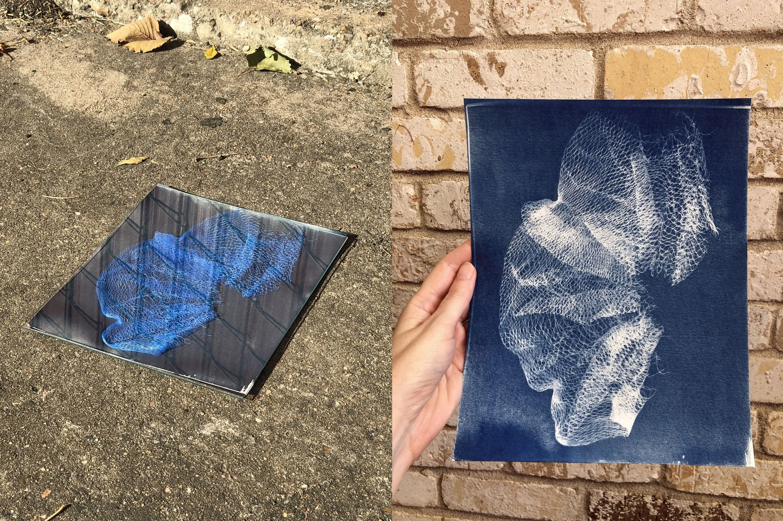 Several years later during the pandemic, that image popped into my head again and I began looking into the cyanotype process and all of the various ways it can be used. I ordered supplies and made my first cyanotype using a piece of an old poufy bath thing.